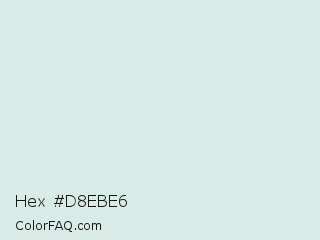 Hex #d8ebe6 Color is a very light cyan color and the nearest color is Swans Down #dcf0ea. Hex code #d8ebe6 and RGB value is rgb(216,235,230). In RGB color space, this color is composed of 85% red, 92% green, 90% blue, In CMYK color space, this color is composed of 8% cyan, 0% magenta, 2% yellow , 8% black , In HSL color space, this color has a hue angle of 164° , 32% saturation and 88% lightness.