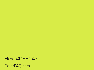 Hex #d8ec47 Color is a normal yellow color and the nearest color is Maximum Green Yellow #d9e650. Hex code #d8ec47 and RGB value is rgb(216,236,71). In RGB color space, this color is composed of 85% red, 93% green, 28% blue, In CMYK color space, this color is composed of 8% cyan, 0% magenta, 70% yellow , 7% black , In HSL color space, this color has a hue angle of 67° , 81% saturation and 60% lightness.