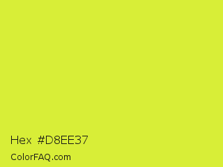 Hex #d8ee37 Color is a normal yellow color and the nearest color is Pear #d1e231. Hex code #d8ee37 and RGB value is rgb(216,238,55). In RGB color space, this color is composed of 85% red, 93% green, 22% blue, In CMYK color space, this color is composed of 9% cyan, 0% magenta, 77% yellow , 7% black , In HSL color space, this color has a hue angle of 67° , 84% saturation and 57% lightness.