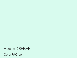 Hex #d8fbee Color is a very light green color and the nearest color is White Ice #ddf9f1. Hex code #d8fbee and RGB value is rgb(216,251,238). In RGB color space, this color is composed of 85% red, 98% green, 93% blue, In CMYK color space, this color is composed of 14% cyan, 0% magenta, 5% yellow , 2% black , In HSL color space, this color has a hue angle of 158° , 81% saturation and 92% lightness.