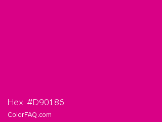 Hex #d90186 Color is a normal magenta color and the nearest color is Mexican Pink #e4007c. Hex code #d90186 and RGB value is rgb(217,1,134). In RGB color space, this color is composed of 85% red, 0% green, 53% blue, In CMYK color space, this color is composed of 0% cyan, 100% magenta, 38% yellow , 15% black , In HSL color space, this color has a hue angle of 323° , 99% saturation and 43% lightness.