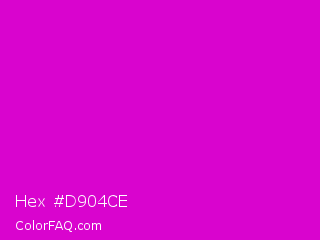 Hex #d904ce Color is a normal magenta color and the nearest color is Deep Magenta #cc00cc. Hex code #d904ce and RGB value is rgb(217,4,206). In RGB color space, this color is composed of 85% red, 2% green, 81% blue, In CMYK color space, this color is composed of 0% cyan, 98% magenta, 5% yellow , 15% black , In HSL color space, this color has a hue angle of 303° , 96% saturation and 43% lightness.
