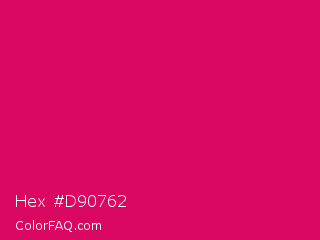 Hex #d90762 Color is a normal rose color and the nearest color is Raspberry #e30b5d. Hex code #d90762 and RGB value is rgb(217,7,98). In RGB color space, this color is composed of 85% red, 3% green, 38% blue, In CMYK color space, this color is composed of 0% cyan, 97% magenta, 55% yellow , 15% black , In HSL color space, this color has a hue angle of 334° , 94% saturation and 44% lightness.