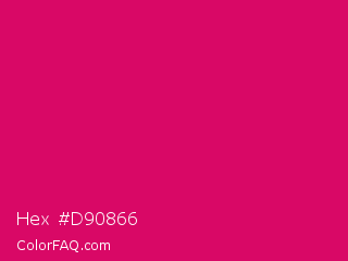 Hex #d90866 Color is a normal rose color and the nearest color is Ruby #e0115f. Hex code #d90866 and RGB value is rgb(217,8,102). In RGB color space, this color is composed of 85% red, 3% green, 40% blue, In CMYK color space, this color is composed of 0% cyan, 96% magenta, 53% yellow , 15% black , In HSL color space, this color has a hue angle of 333° , 93% saturation and 44% lightness.