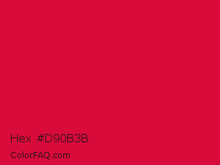 Hex #d90b3b Color is a normal red color and the nearest color is Crimson #dc143c. Hex code #d90b3b and RGB value is rgb(217,11,59). In RGB color space, this color is composed of 85% red, 4% green, 23% blue, In CMYK color space, this color is composed of 0% cyan, 95% magenta, 73% yellow , 15% black , In HSL color space, this color has a hue angle of 346° , 90% saturation and 45% lightness.