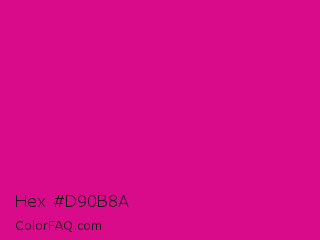 Hex #d90b8a Color is a normal magenta color and the nearest color is Vivid Cerise #da1d81. Hex code #d90b8a and RGB value is rgb(217,11,138). In RGB color space, this color is composed of 85% red, 4% green, 54% blue, In CMYK color space, this color is composed of 0% cyan, 95% magenta, 36% yellow , 15% black , In HSL color space, this color has a hue angle of 323° , 90% saturation and 45% lightness.