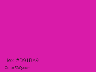 Hex #d91ba9 Color is a normal magenta color and the nearest color is Frostbite #e936a7. Hex code #d91ba9 and RGB value is rgb(217,27,169). In RGB color space, this color is composed of 85% red, 11% green, 66% blue, In CMYK color space, this color is composed of 0% cyan, 88% magenta, 22% yellow , 15% black , In HSL color space, this color has a hue angle of 315° , 78% saturation and 48% lightness.