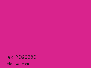 Hex #d9238d Color is a normal magenta color and the nearest color is Barbie Pink #e0218a. Hex code #d9238d and RGB value is rgb(217,35,141). In RGB color space, this color is composed of 85% red, 14% green, 55% blue, In CMYK color space, this color is composed of 0% cyan, 84% magenta, 35% yellow , 15% black , In HSL color space, this color has a hue angle of 325° , 72% saturation and 49% lightness.
