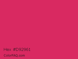 Hex #d92961 Color is a normal rose color and the nearest color is Cerise Red #de3163. Hex code #d92961 and RGB value is rgb(217,41,97). In RGB color space, this color is composed of 85% red, 16% green, 38% blue, In CMYK color space, this color is composed of 0% cyan, 81% magenta, 55% yellow , 15% black , In HSL color space, this color has a hue angle of 341° , 70% saturation and 51% lightness.