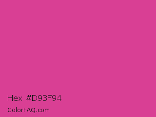 Hex #d93f94 Color is a normal magenta color and the nearest color is Pink Pantone #d74894. Hex code #d93f94 and RGB value is rgb(217,63,148). In RGB color space, this color is composed of 85% red, 25% green, 58% blue, In CMYK color space, this color is composed of 0% cyan, 71% magenta, 32% yellow , 15% black , In HSL color space, this color has a hue angle of 327° , 67% saturation and 55% lightness.