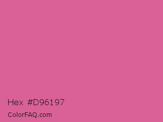 Hex #d96197 Color is a light rose color and the nearest color is Pale Red Violet #db7093. Hex code #d96197 and RGB value is rgb(217,97,151). In RGB color space, this color is composed of 85% red, 38% green, 59% blue, In CMYK color space, this color is composed of 0% cyan, 55% magenta, 30% yellow , 15% black , In HSL color space, this color has a hue angle of 333° , 61% saturation and 62% lightness.