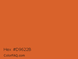 Hex #d9622b Color is a normal orange color and the nearest color is Vivid Red Tangelo #df6124. Hex code #d9622b and RGB value is rgb(217,98,43). In RGB color space, this color is composed of 85% red, 38% green, 17% blue, In CMYK color space, this color is composed of 0% cyan, 55% magenta, 80% yellow , 15% black , In HSL color space, this color has a hue angle of 19° , 70% saturation and 51% lightness.
