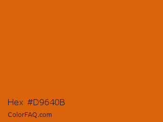 Hex #d9640b Color is a normal orange color and the nearest color is Bamboo #da6304. Hex code #d9640b and RGB value is rgb(217,100,11). In RGB color space, this color is composed of 85% red, 39% green, 4% blue, In CMYK color space, this color is composed of 0% cyan, 54% magenta, 95% yellow , 15% black , In HSL color space, this color has a hue angle of 26° , 90% saturation and 45% lightness.