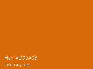 Hex #d96a08 Color is a normal orange color and the nearest color is Bamboo #da6304. Hex code #d96a08 and RGB value is rgb(217,106,8). In RGB color space, this color is composed of 85% red, 42% green, 3% blue, In CMYK color space, this color is composed of 0% cyan, 51% magenta, 96% yellow , 15% black , In HSL color space, this color has a hue angle of 28° , 93% saturation and 44% lightness.