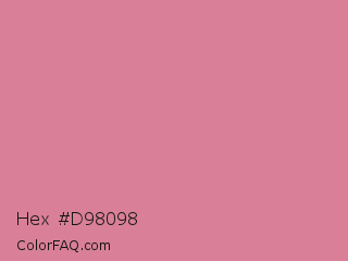 Hex #d98098 Color is a light rose color and the nearest color is Shimmering Blush #d98695. Hex code #d98098 and RGB value is rgb(217,128,152). In RGB color space, this color is composed of 85% red, 50% green, 60% blue, In CMYK color space, this color is composed of 0% cyan, 41% magenta, 30% yellow , 15% black , In HSL color space, this color has a hue angle of 344° , 54% saturation and 68% lightness.