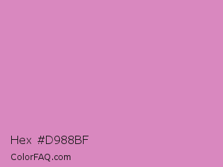 Hex #d988bf Color is a light magenta color and the nearest color is Middle Purple #d982b5. Hex code #d988bf and RGB value is rgb(217,136,191). In RGB color space, this color is composed of 85% red, 53% green, 75% blue, In CMYK color space, this color is composed of 0% cyan, 37% magenta, 12% yellow , 15% black , In HSL color space, this color has a hue angle of 319° , 52% saturation and 69% lightness.