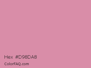 Hex #d98da8 Color is a light rose color and the nearest color is Can Can #d591a4. Hex code #d98da8 and RGB value is rgb(217,141,168). In RGB color space, this color is composed of 85% red, 55% green, 66% blue, In CMYK color space, this color is composed of 0% cyan, 35% magenta, 23% yellow , 15% black , In HSL color space, this color has a hue angle of 339° , 50% saturation and 70% lightness.