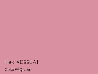 Hex #d991a1 Color is a light red color and the nearest color is Can Can #d591a4. Hex code #d991a1 and RGB value is rgb(217,145,161). In RGB color space, this color is composed of 85% red, 57% green, 63% blue, In CMYK color space, this color is composed of 0% cyan, 33% magenta, 26% yellow , 15% black , In HSL color space, this color has a hue angle of 347° , 49% saturation and 71% lightness.