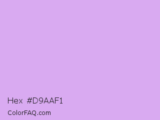 Hex #d9aaf1 Color is a very light purple color and the nearest color is Bright Ube #d19fe8. Hex code #d9aaf1 and RGB value is rgb(217,170,241). In RGB color space, this color is composed of 85% red, 67% green, 95% blue, In CMYK color space, this color is composed of 10% cyan, 29% magenta, 0% yellow , 5% black , In HSL color space, this color has a hue angle of 280° , 72% saturation and 81% lightness.