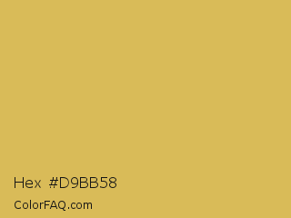 Hex #d9bb58 Color is a normal yellow color and the nearest color is Tacha #d6c562. Hex code #d9bb58 and RGB value is rgb(217,187,88). In RGB color space, this color is composed of 85% red, 73% green, 35% blue, In CMYK color space, this color is composed of 0% cyan, 14% magenta, 59% yellow , 15% black , In HSL color space, this color has a hue angle of 46° , 63% saturation and 60% lightness.