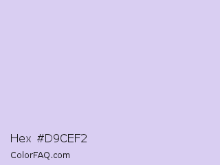 Hex #d9cef2 Color is a very light indigo color and the nearest color is Moon Raker #d6cef6. Hex code #d9cef2 and RGB value is rgb(217,206,242). In RGB color space, this color is composed of 85% red, 81% green, 95% blue, In CMYK color space, this color is composed of 10% cyan, 15% magenta, 0% yellow , 5% black , In HSL color space, this color has a hue angle of 258° , 58% saturation and 88% lightness.
