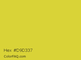 Hex #d9d337 Color is a normal yellow color and the nearest color is Wattle #dcd747. Hex code #d9d337 and RGB value is rgb(217,211,55). In RGB color space, this color is composed of 85% red, 83% green, 22% blue, In CMYK color space, this color is composed of 0% cyan, 3% magenta, 75% yellow , 15% black , In HSL color space, this color has a hue angle of 58° , 68% saturation and 53% lightness.