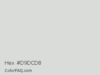 Hex #d9dcd8 Color is a very light green color and the nearest color is Alto #dbdbdb. Hex code #d9dcd8 and RGB value is rgb(217,220,216). In RGB color space, this color is composed of 85% red, 86% green, 85% blue, In CMYK color space, this color is composed of 1% cyan, 0% magenta, 2% yellow , 14% black , In HSL color space, this color has a hue angle of 105° , 5% saturation and 85% lightness.