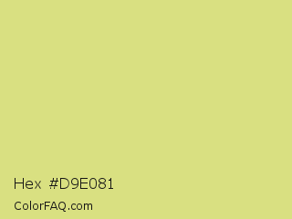 Hex #d9e081 Color is a light yellow color and the nearest color is Medium Spring Bud #c9dc87. Hex code #d9e081 and RGB value is rgb(217,224,129). In RGB color space, this color is composed of 85% red, 88% green, 51% blue, In CMYK color space, this color is composed of 3% cyan, 0% magenta, 42% yellow , 12% black , In HSL color space, this color has a hue angle of 64° , 61% saturation and 69% lightness.