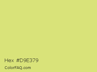 Hex #d9e379 Color is a light yellow color and the nearest color is Booger Buster #dde26a. Hex code #d9e379 and RGB value is rgb(217,227,121). In RGB color space, this color is composed of 85% red, 89% green, 47% blue, In CMYK color space, this color is composed of 4% cyan, 0% magenta, 47% yellow , 11% black , In HSL color space, this color has a hue angle of 66° , 65% saturation and 68% lightness.