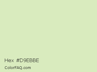 Hex #d9ebbe Color is a very light green color and the nearest color is Beryl Green #dee5c0. Hex code #d9ebbe and RGB value is rgb(217,235,190). In RGB color space, this color is composed of 85% red, 92% green, 75% blue, In CMYK color space, this color is composed of 8% cyan, 0% magenta, 19% yellow , 8% black , In HSL color space, this color has a hue angle of 84° , 53% saturation and 83% lightness.