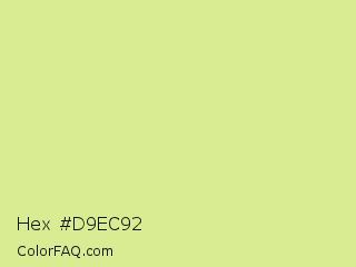 Hex #d9ec92 Color is a light lime color and the nearest color is Key Lime #e8f48c. Hex code #d9ec92 and RGB value is rgb(217,236,146). In RGB color space, this color is composed of 85% red, 93% green, 57% blue, In CMYK color space, this color is composed of 8% cyan, 0% magenta, 38% yellow , 7% black , In HSL color space, this color has a hue angle of 73° , 70% saturation and 75% lightness.
