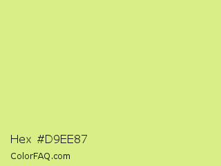 Hex #d9ee87 Color is a light lime color and the nearest color is Mindaro #e3f988. Hex code #d9ee87 and RGB value is rgb(217,238,135). In RGB color space, this color is composed of 85% red, 93% green, 53% blue, In CMYK color space, this color is composed of 9% cyan, 0% magenta, 43% yellow , 7% black , In HSL color space, this color has a hue angle of 72° , 75% saturation and 73% lightness.
