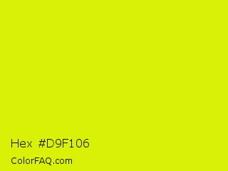 Hex #d9f106 Color is a normal yellow color and the nearest color is Chartreuse Yellow #dfff00. Hex code #d9f106 and RGB value is rgb(217,241,6). In RGB color space, this color is composed of 85% red, 95% green, 2% blue, In CMYK color space, this color is composed of 10% cyan, 0% magenta, 98% yellow , 5% black , In HSL color space, this color has a hue angle of 66° , 95% saturation and 48% lightness.