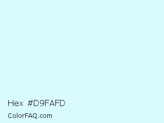 Hex #d9fafd Color is a very light cyan color and the nearest color is Oyster Bay #dafaff. Hex code #d9fafd and RGB value is rgb(217,250,253). In RGB color space, this color is composed of 85% red, 98% green, 99% blue, In CMYK color space, this color is composed of 14% cyan, 1% magenta, 0% yellow , 1% black , In HSL color space, this color has a hue angle of 185° , 90% saturation and 92% lightness.