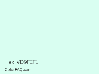 Hex #d9fef1 Color is a very light green color and the nearest color is White Ice #ddf9f1. Hex code #d9fef1 and RGB value is rgb(217,254,241). In RGB color space, this color is composed of 85% red, 100% green, 95% blue, In CMYK color space, this color is composed of 15% cyan, 0% magenta, 5% yellow , 0% black , In HSL color space, this color has a hue angle of 159° , 95% saturation and 92% lightness.