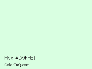 Hex #d9ffe1 Color is a very light green color and the nearest color is Snowy Mint #d6ffdb. Hex code #d9ffe1 and RGB value is rgb(217,255,225). In RGB color space, this color is composed of 85% red, 100% green, 88% blue, In CMYK color space, this color is composed of 15% cyan, 0% magenta, 12% yellow , 0% black , In HSL color space, this color has a hue angle of 133° , 100% saturation and 93% lightness.