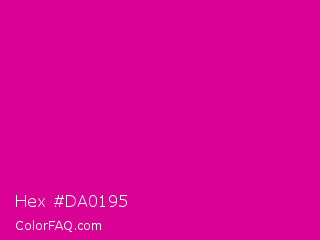 Hex #da0195 Color is a normal magenta color and the nearest color is Mexican Pink #e4007c. Hex code #da0195 and RGB value is rgb(218,1,149). In RGB color space, this color is composed of 85% red, 0% green, 58% blue, In CMYK color space, this color is composed of 0% cyan, 100% magenta, 32% yellow , 15% black , In HSL color space, this color has a hue angle of 319° , 99% saturation and 43% lightness.