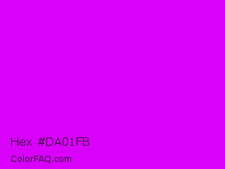 Hex #da01fb Color is a normal magenta color and the nearest color is Phlox #df00ff. Hex code #da01fb and RGB value is rgb(218,1,251). In RGB color space, this color is composed of 85% red, 0% green, 98% blue, In CMYK color space, this color is composed of 13% cyan, 100% magenta, 0% yellow , 2% black , In HSL color space, this color has a hue angle of 292° , 99% saturation and 49% lightness.
