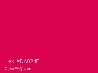 Hex #da024e Color is a normal rose color and the nearest color is UA Red #d9004c. Hex code #da024e and RGB value is rgb(218,2,78). In RGB color space, this color is composed of 85% red, 1% green, 31% blue, In CMYK color space, this color is composed of 0% cyan, 99% magenta, 64% yellow , 15% black , In HSL color space, this color has a hue angle of 339° , 98% saturation and 43% lightness.