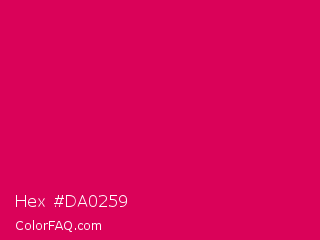 Hex #da0259 Color is a normal rose color and the nearest color is Rubine Red #d10056. Hex code #da0259 and RGB value is rgb(218,2,89). In RGB color space, this color is composed of 85% red, 1% green, 35% blue, In CMYK color space, this color is composed of 0% cyan, 99% magenta, 59% yellow , 15% black , In HSL color space, this color has a hue angle of 336° , 98% saturation and 43% lightness.