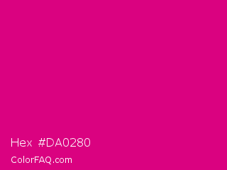 Hex #da0280 Color is a normal magenta color and the nearest color is Mexican Pink #e4007c. Hex code #da0280 and RGB value is rgb(218,2,128). In RGB color space, this color is composed of 85% red, 1% green, 50% blue, In CMYK color space, this color is composed of 0% cyan, 99% magenta, 41% yellow , 15% black , In HSL color space, this color has a hue angle of 325° , 98% saturation and 43% lightness.
