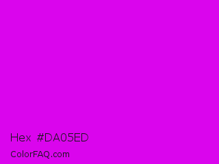 Hex #da05ed Color is a normal magenta color and the nearest color is Phlox #df00ff. Hex code #da05ed and RGB value is rgb(218,5,237). In RGB color space, this color is composed of 85% red, 2% green, 93% blue, In CMYK color space, this color is composed of 8% cyan, 98% magenta, 0% yellow , 7% black , In HSL color space, this color has a hue angle of 295° , 96% saturation and 47% lightness.