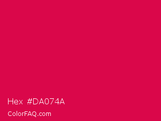 Hex #da074a Color is a normal rose color and the nearest color is UA Red #d9004c. Hex code #da074a and RGB value is rgb(218,7,74). In RGB color space, this color is composed of 85% red, 3% green, 29% blue, In CMYK color space, this color is composed of 0% cyan, 97% magenta, 66% yellow , 15% black , In HSL color space, this color has a hue angle of 341° , 94% saturation and 44% lightness.