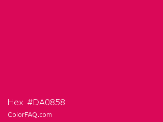Hex #da0858 Color is a normal rose color and the nearest color is Debian Red #d70a53. Hex code #da0858 and RGB value is rgb(218,8,88). In RGB color space, this color is composed of 85% red, 3% green, 35% blue, In CMYK color space, this color is composed of 0% cyan, 96% magenta, 60% yellow , 15% black , In HSL color space, this color has a hue angle of 337° , 93% saturation and 44% lightness.
