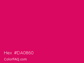Hex #da0860 Color is a normal rose color and the nearest color is Raspberry #e30b5d. Hex code #da0860 and RGB value is rgb(218,8,96). In RGB color space, this color is composed of 85% red, 3% green, 38% blue, In CMYK color space, this color is composed of 0% cyan, 96% magenta, 56% yellow , 15% black , In HSL color space, this color has a hue angle of 335° , 93% saturation and 44% lightness.