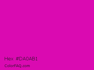 Hex #da0ab1 Color is a normal magenta color and the nearest color is Deep Magenta #cc00cc. Hex code #da0ab1 and RGB value is rgb(218,10,177). In RGB color space, this color is composed of 85% red, 4% green, 69% blue, In CMYK color space, this color is composed of 0% cyan, 95% magenta, 19% yellow , 15% black , In HSL color space, this color has a hue angle of 312° , 91% saturation and 45% lightness.