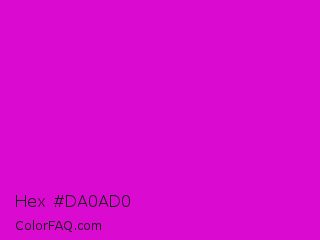 Hex #da0ad0 Color is a normal magenta color and the nearest color is Deep Magenta #cc00cc. Hex code #da0ad0 and RGB value is rgb(218,10,208). In RGB color space, this color is composed of 85% red, 4% green, 82% blue, In CMYK color space, this color is composed of 0% cyan, 95% magenta, 5% yellow , 15% black , In HSL color space, this color has a hue angle of 303° , 91% saturation and 45% lightness.
