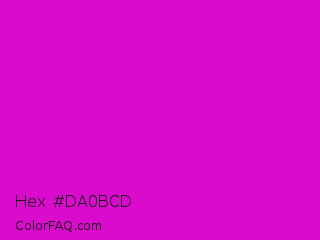 Hex #da0bcd Color is a normal magenta color and the nearest color is Deep Magenta #cc00cc. Hex code #da0bcd and RGB value is rgb(218,11,205). In RGB color space, this color is composed of 85% red, 4% green, 80% blue, In CMYK color space, this color is composed of 0% cyan, 95% magenta, 6% yellow , 15% black , In HSL color space, this color has a hue angle of 304° , 90% saturation and 45% lightness.