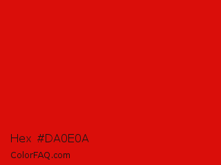 Hex #da0e0a Color is a normal red color and the nearest color is Rosso Corsa #d40000. Hex code #da0e0a and RGB value is rgb(218,14,10). In RGB color space, this color is composed of 85% red, 5% green, 4% blue, In CMYK color space, this color is composed of 0% cyan, 94% magenta, 95% yellow , 15% black , In HSL color space, this color has a hue angle of 1° , 91% saturation and 45% lightness.