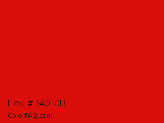 Hex #da0f0b Color is a normal red color and the nearest color is Rosso Corsa #d40000. Hex code #da0f0b and RGB value is rgb(218,15,11). In RGB color space, this color is composed of 85% red, 6% green, 4% blue, In CMYK color space, this color is composed of 0% cyan, 93% magenta, 95% yellow , 15% black , In HSL color space, this color has a hue angle of 1° , 90% saturation and 45% lightness.
